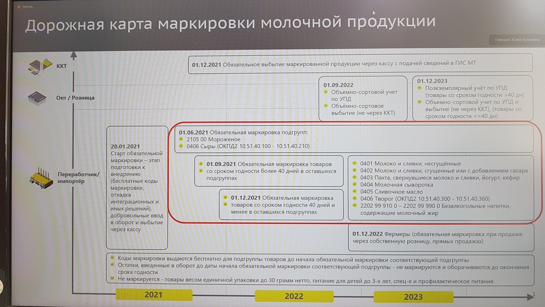 Постановлением Правительства Российской Федерации от 15 декабря 2020 № 2099 «Об утверждении Правил маркировки молочной продукции средствами идентификации и особенностях внедрения государственной информационной системы мониторинга за оборотом товаров, подлежащих обязательной маркировке средствами идентификации, в отношении молочной продукции» определены сроки введения обязательной маркировки молочной продукции.