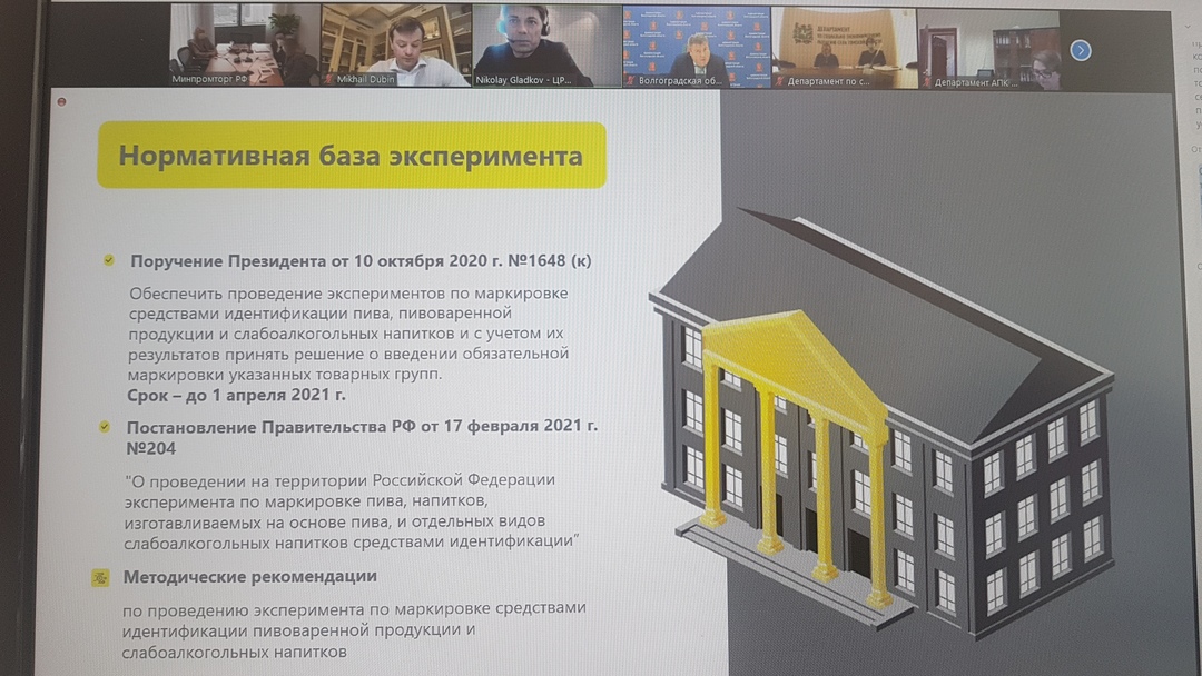 Кроме того, обсуждался вопрос планируемого эксперимента по маркировке средствами идентификации пива, напитков, изготавливаемых на основе пива и отдельных видов слабоалкогольных напитков.