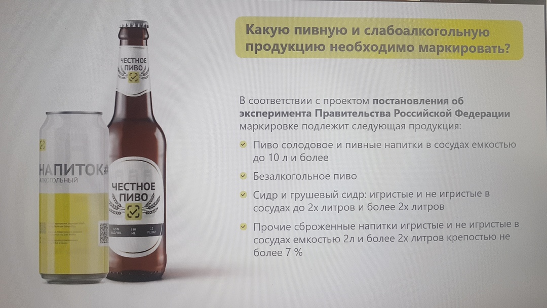 Так, в соответствии с постановлением Правительства Российской Федерации от 17.02.2021 № 204 «О проведении на территории Российской Федерации эксперимента по маркировке пива, напитков, изготавливаемых на основе пива, и отдельных видов слабоалкогольных напитков средствами идентификации» с 1 апреля 2021 года стартует эксперимента по маркировке пива, который продлится до 31 августа 2022 года.