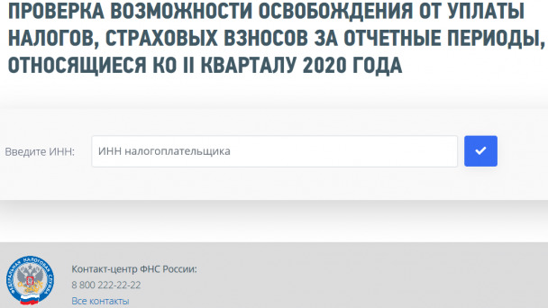 ФНС России запустила сервис, который поможет налогоплательщикам получить информацию, освобождаются ли они от уплаты налогов, авансовых платежей по налогам, сборам и страховым взносам за отчетные (налоговые) периоды II квартала 2020 года.
