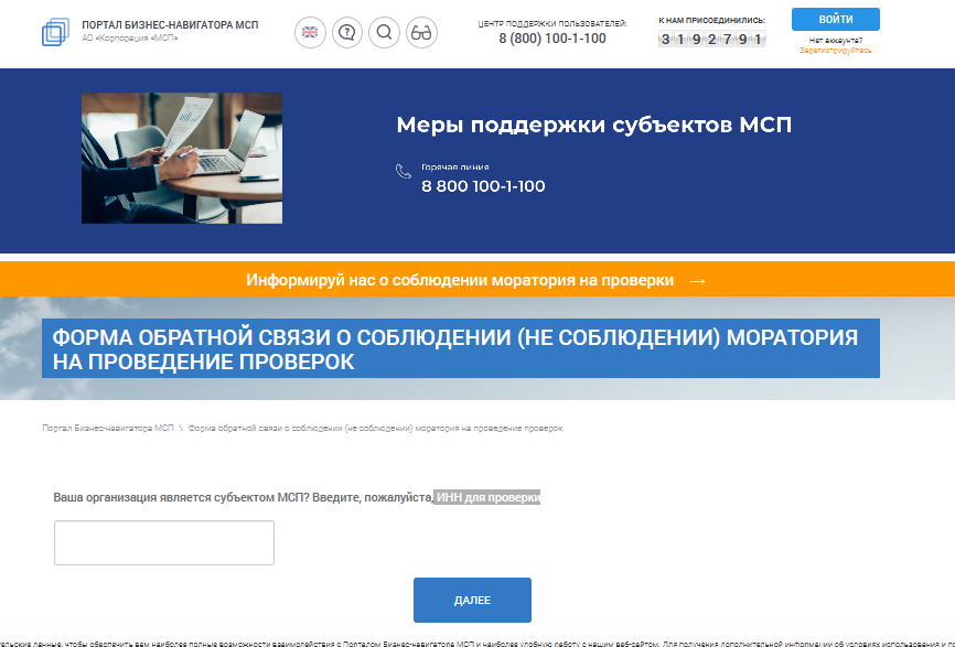 В настоящее время продолжает функционировать механизм для направления предпринимателями обращений о проведении проверок после введения указанного моратория, в котором необходимо заполнить форму обратной связи о соблюдении (не соблюдении) моратория на проведение проверок указав свой ИНН и ответив на соответствующие вопросы перейдя по ссылке: https://smbn.ru/moratorium.htm.